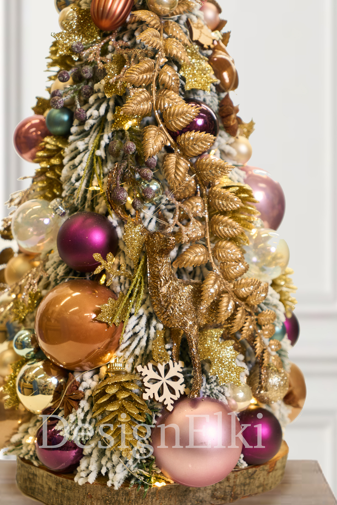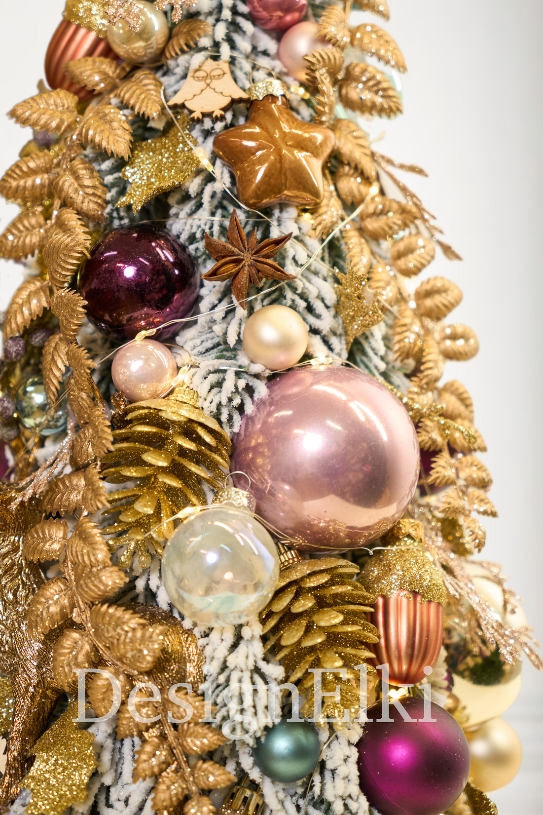 Ель декорирована игрушками природных оттенков, создающими атмосферу леса, окутанного первым снегом: туманно-голубого, пурпурного, золотого и медового. Деревце, в ветви которого уже вплетена нежная роса-гирлянда, станет отличным украшением для дома и офиса. Ель ручной работы, что делает композицию особенным подарком для любителей природы и оригинальных вещей.