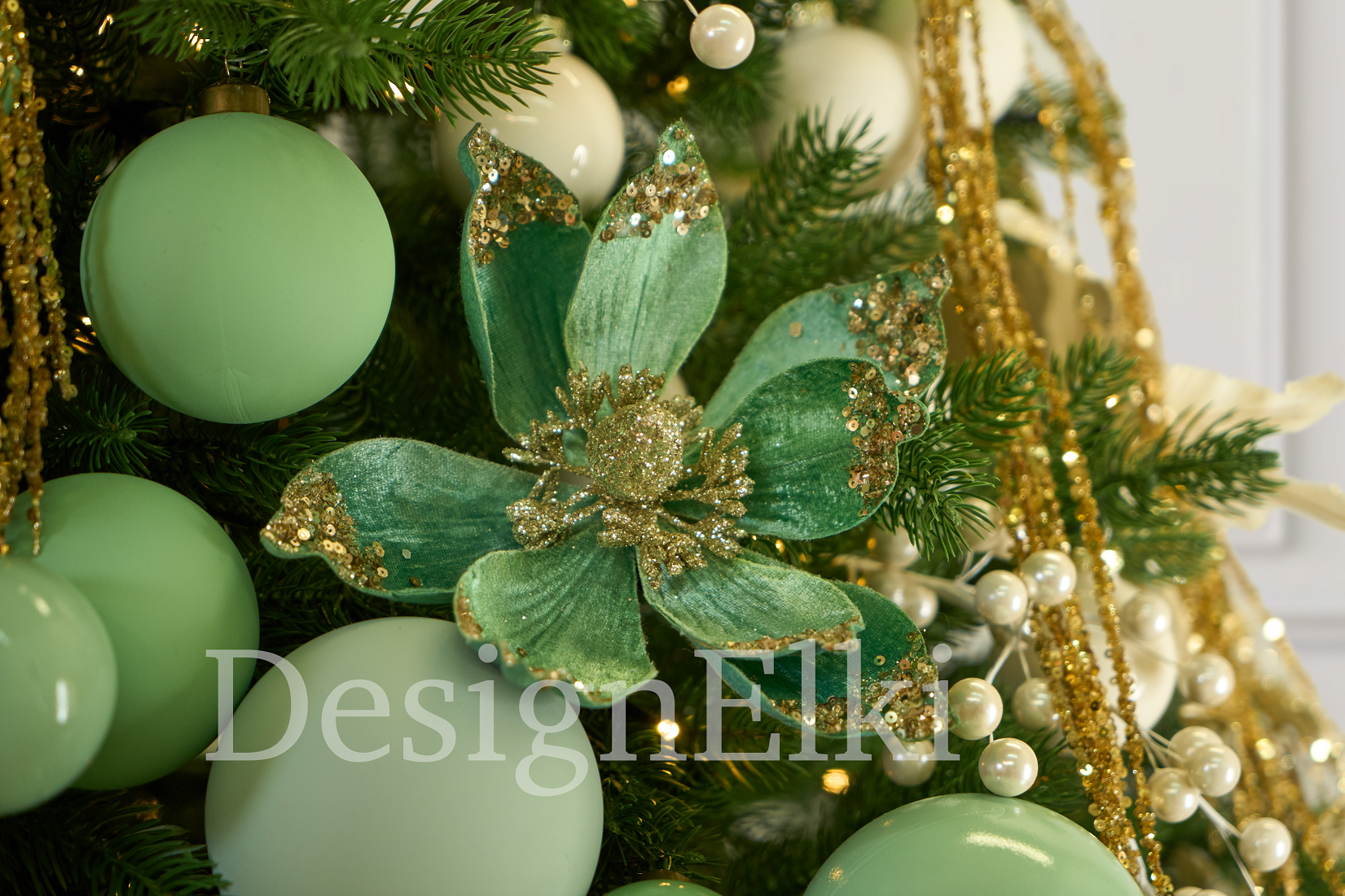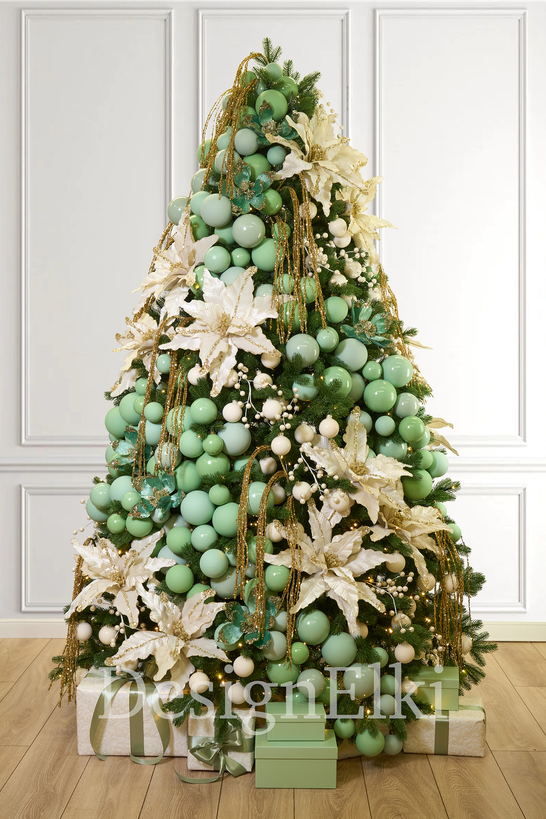 Ель похожа на свежеиспеченный капкейк. Именитый кондитер не пожалел драже — шары всех оттенков зеленого усыпали ветви сверху донизу. Довершают образ нежно-кремовые цветы пуансеттии. Осталось добавить нити золотистой канители, и десерт готов. Приятного Нового года!