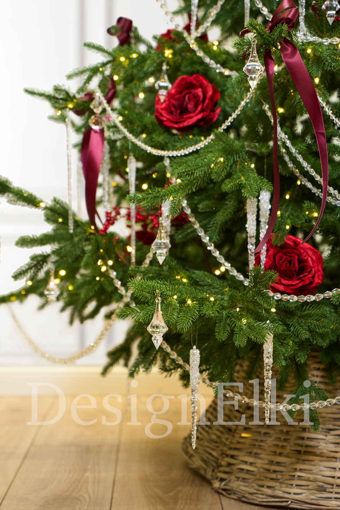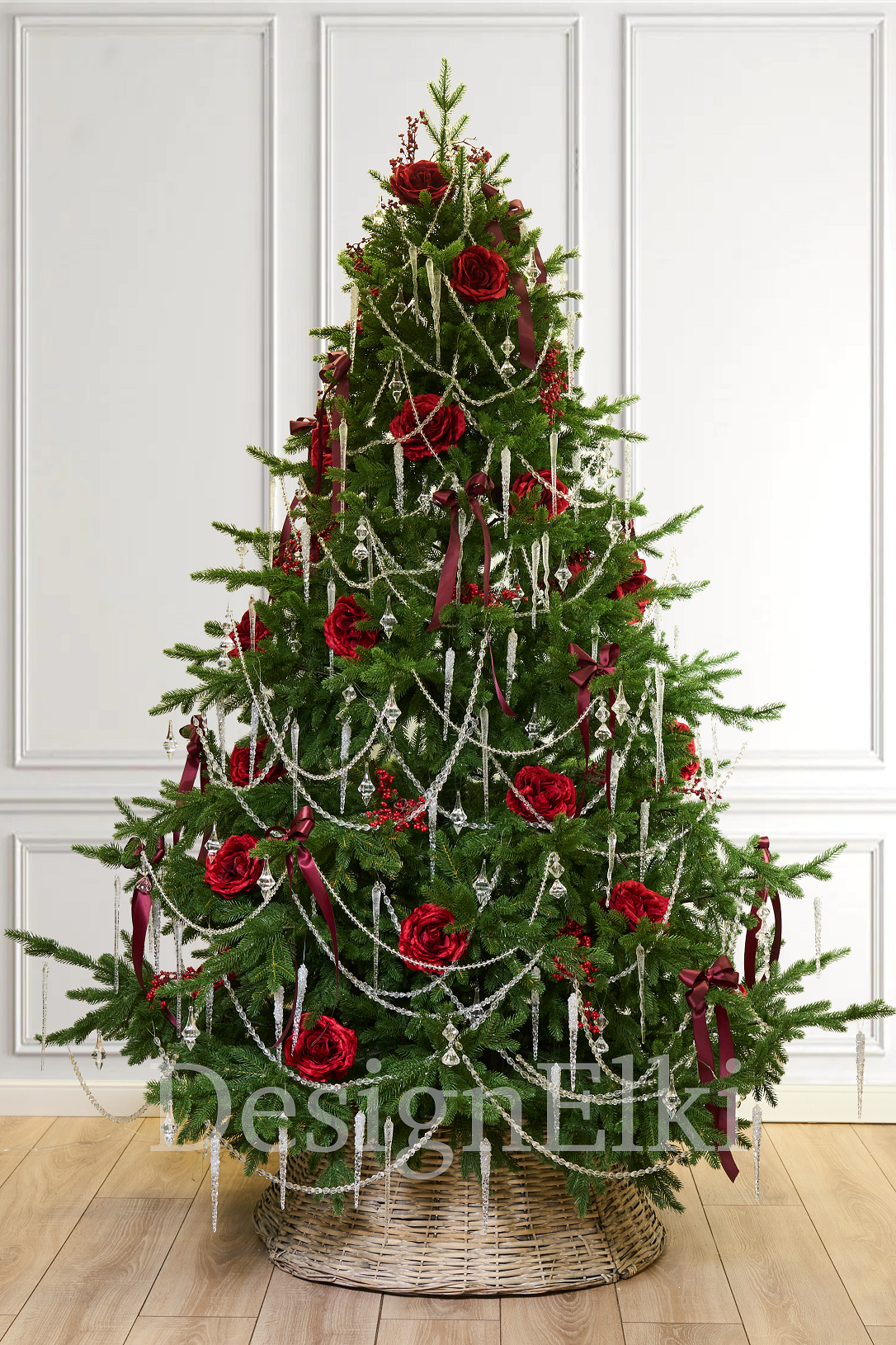 Ель словно сошла с обложки модного журнала. По своему очертанию крона неотличима от натурального дерева. Ветви украшены бархатными розами темно-красного оттенка – символом радости и обновления. Теплая и шелковистая текстура цветов разбавлена хрустальными бусами и подвесками. Они по-особенному отражают свет гирлянд и наполняют пространство вокруг себя мягким мерцанием. Возле этой элегантной и лаконичной ели получаются отличные снимки, которые украсят и семейный архив, и глянцевые обложки.
