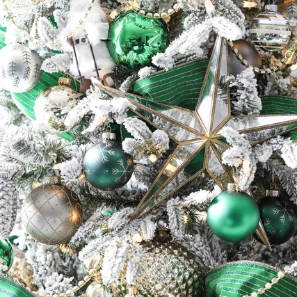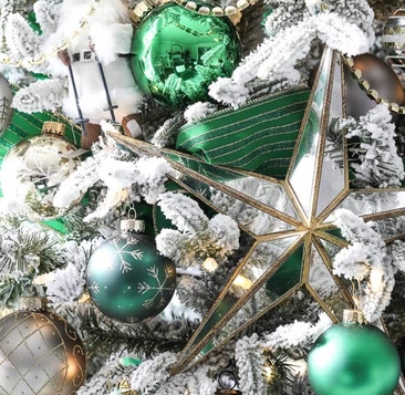 В Рождестве появился новый зеленый цвет. Изумрудно-зеленые украшения ошеломляют рядом с серебром и кажутся по-настоящему роскошными с большим количеством золота. Изумруд также отлично смотрится с другими зелеными оттенками — от бирюзовых до павлиньих и от аквамарина до темно-морского. Волшебный эффект возникнет, если соедините изумрудный с фиолетовым. Рождественский красный и зимний белый также уместны с изумрудными украшениями.