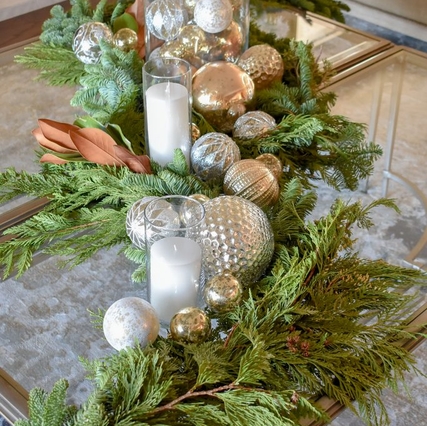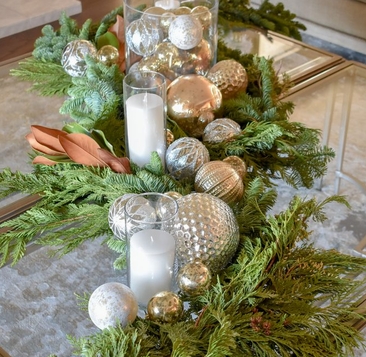 Благородные металлы всегда в моде. Платиновые и бронзовые, золотые и серебряные аксессуары придают элегантность убранству. Они превосходно сочетаются с традиционным красным и зеленым. Смешайте серебряные или золотые украшения со стеклянными шарами из изумрудно-зеленого и модного бирюзового дерева, или дополните их блестящим ртутным стеклом. Новогодние коллекции металлических оттенков притягивают внимание и красиво мерцают на венках, хвойных гирляндах, на украшениях каминов и в декоре столешниц.