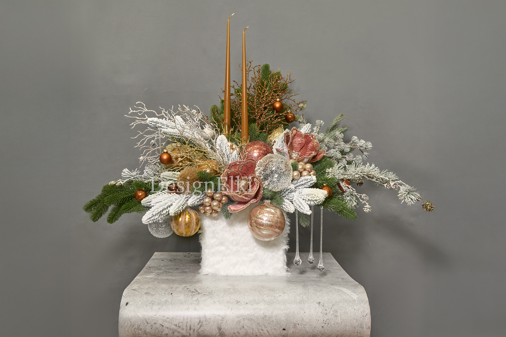 В декоре гармонично соединяются тепло и зимняя свежесть, торжественность свечей и мягкость материалов. Праздничная композиция станет отличным украшением дома.