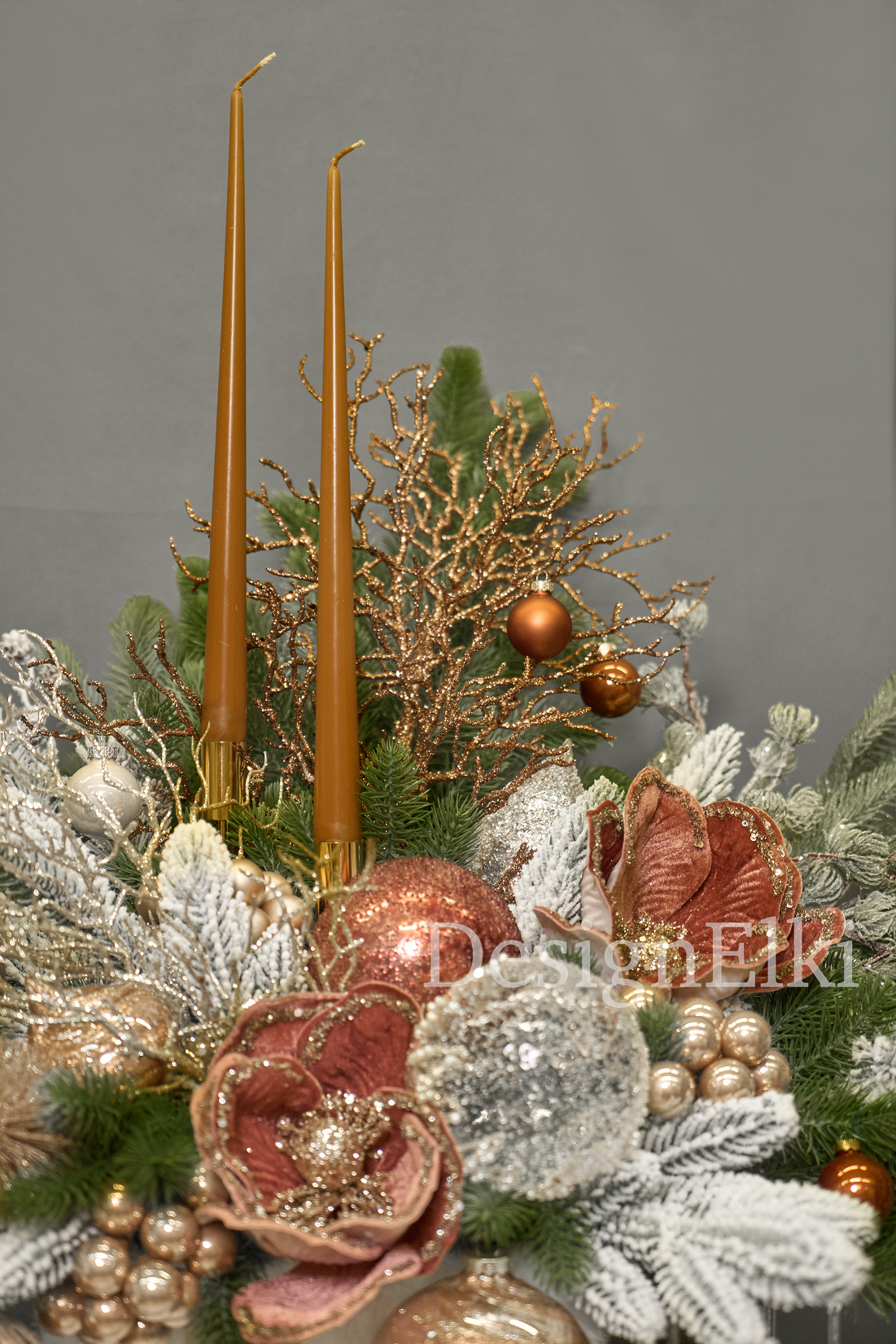 Главная изюминка оформления — это глубокая палитра металликов и игра фактур. Тепло сияют шары медного оттенка и перекликаются со стеклянными шарами в золотистой вуали. Контраст смягчают бархатистые соцветия карамельной магнолии. С ними перекликаются шары, словно обсыпанные сахарной пудрой, стеклянные грозди, которые искрятся на свету.