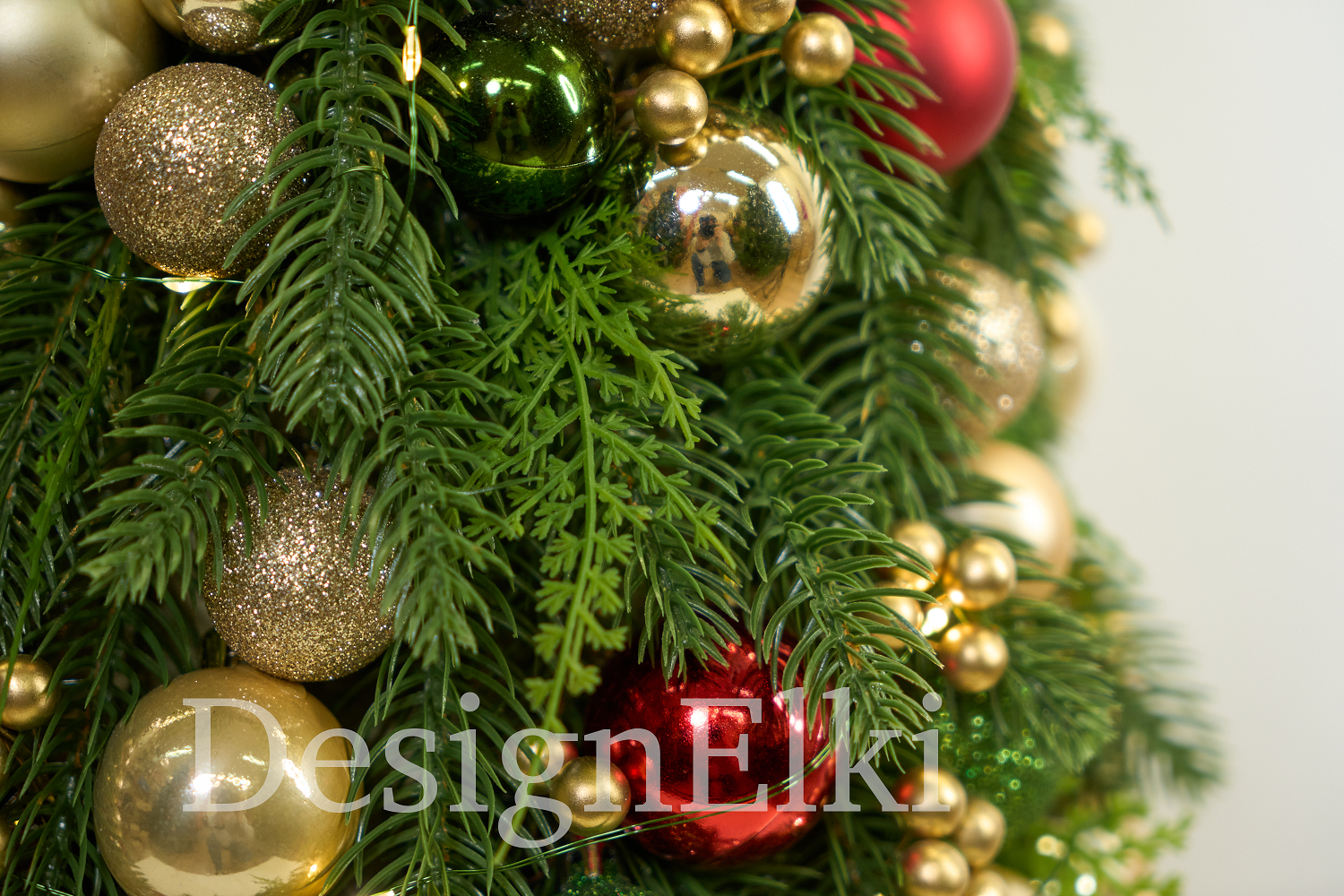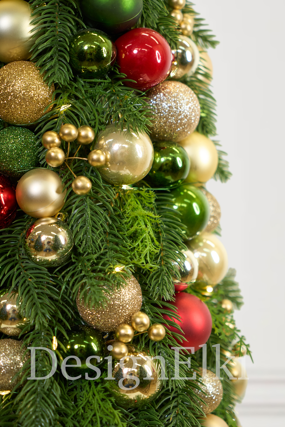 Ель ручной работы украшена в традиционной гамме. Темную зелень оттеняют яркие шары и грозди золотых ягод. В хвое мерцают огни невидимой гирлянды-росы. Ель приковывает взгляды гостей, создает уют и праздник в доме.