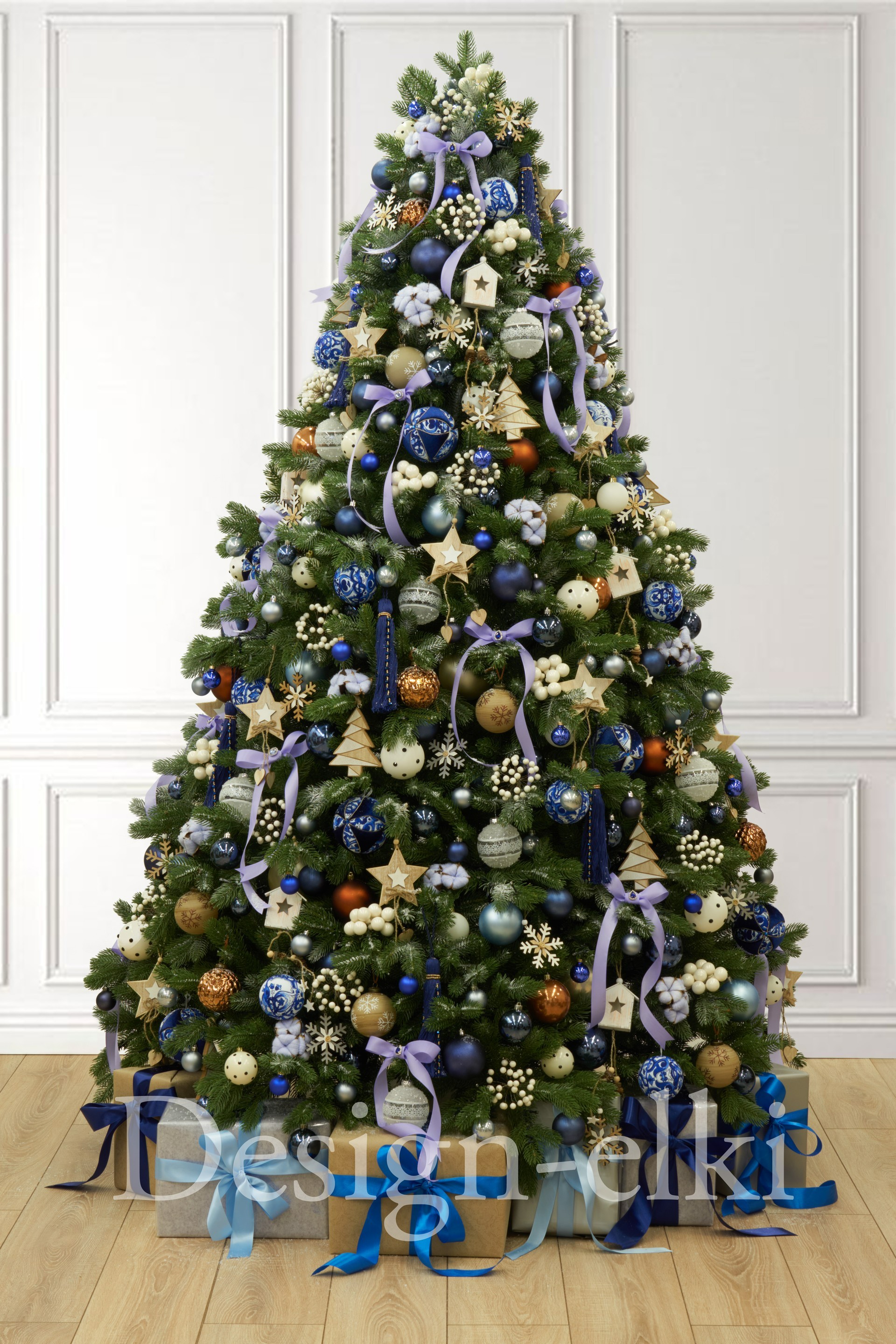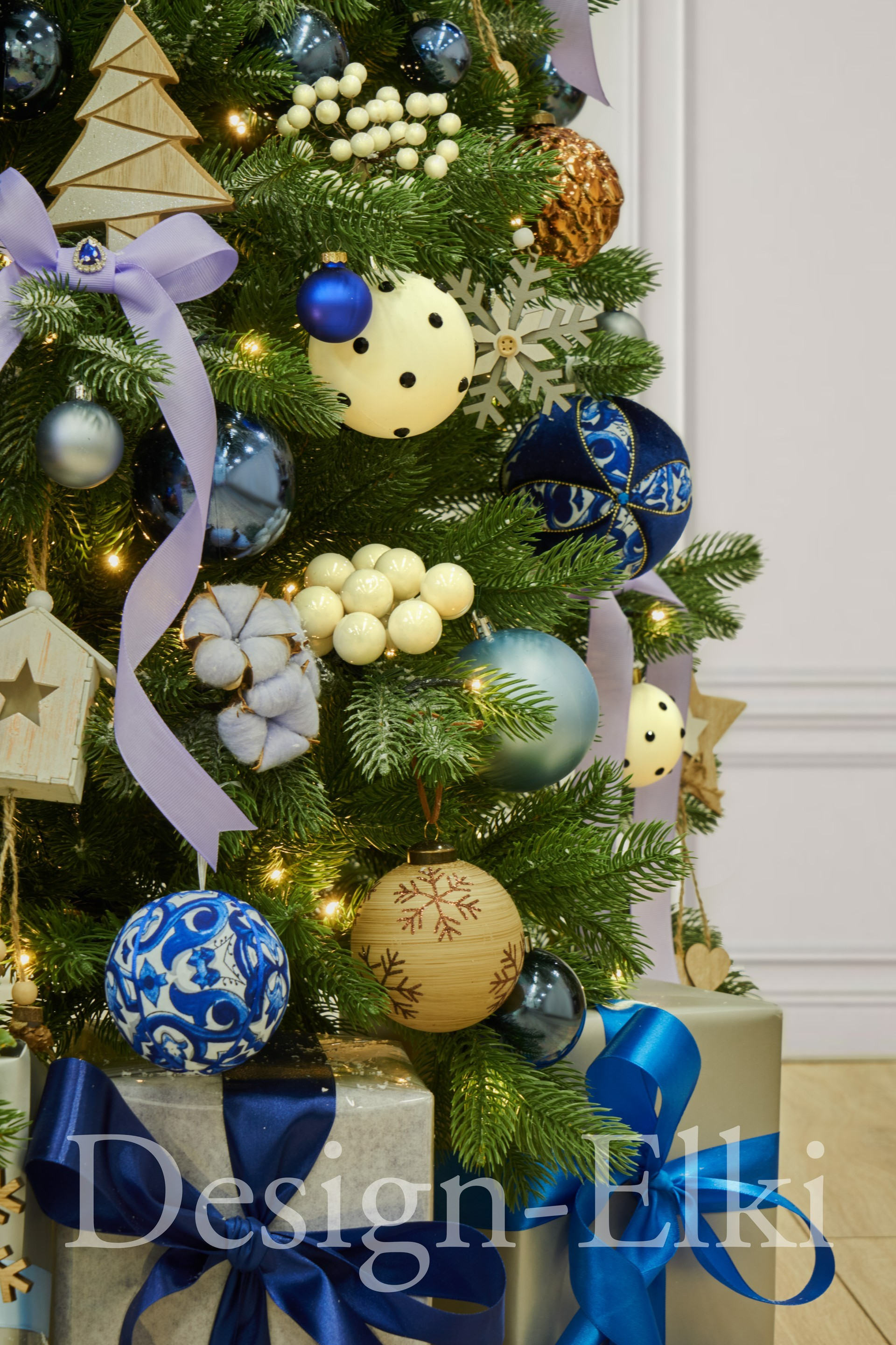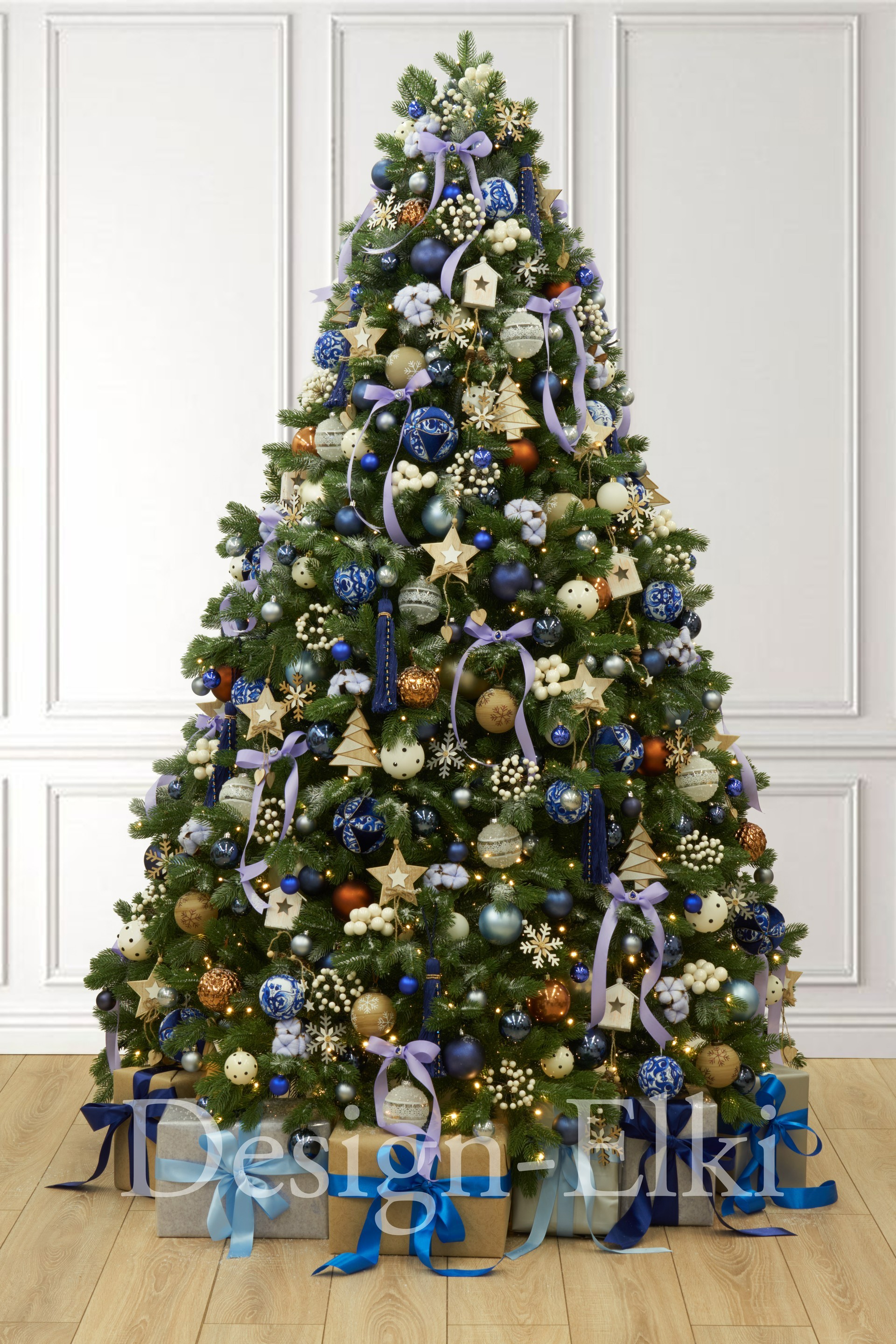 Сочетание простоты и изысканности. В палитре присутствуют нежные оттенки цветов, которые рождают ассоциации с уютным домом, утопающим в пушистых синих сугробах. Основной тон задают шары сапфирового цвета. Их оттеняют полновесные ягодные гроздья-словно снежинки из детства. Глаз радуют шары ручной работы, а дополняют картину воздушные облачка хлопка, которые наводят на мысль об уютной гостиной и теплом пледе. Облики семейного очага и свечей пляшут на боках шаров медного цвета. Свежесть образу придают банты лавандового цвета со сверкающими кристаллами. Необычные снежинки, звезды и елочки, выполненные из дерева, подчеркивают естественность и экологичность стиля. Ель «Кантри» оценят любители романтики и уюта, поклонники минимализма и природных мотивов.
