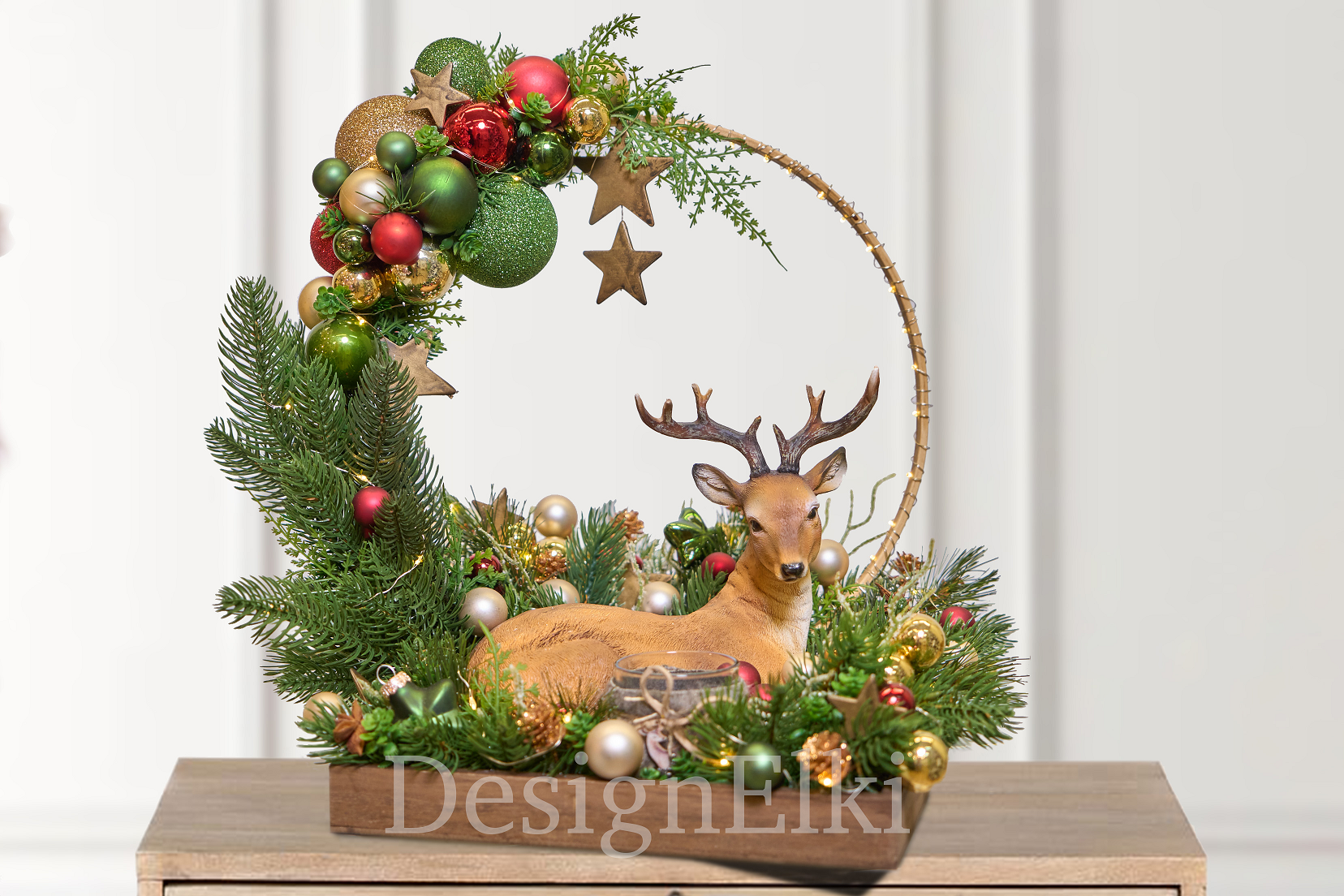 Композиция с праздничным настроением. Яркие новогодние шары в классических красных, зеленых и золотых оттенках, символизирующие радость, надежду и богатство, мерцают в свете гирлянд. В центре внимания – изящный олень, притаившийся в зеленой хвое. Волшебная композиция создаст в доме неповторимую атмосферу зимнего леса.