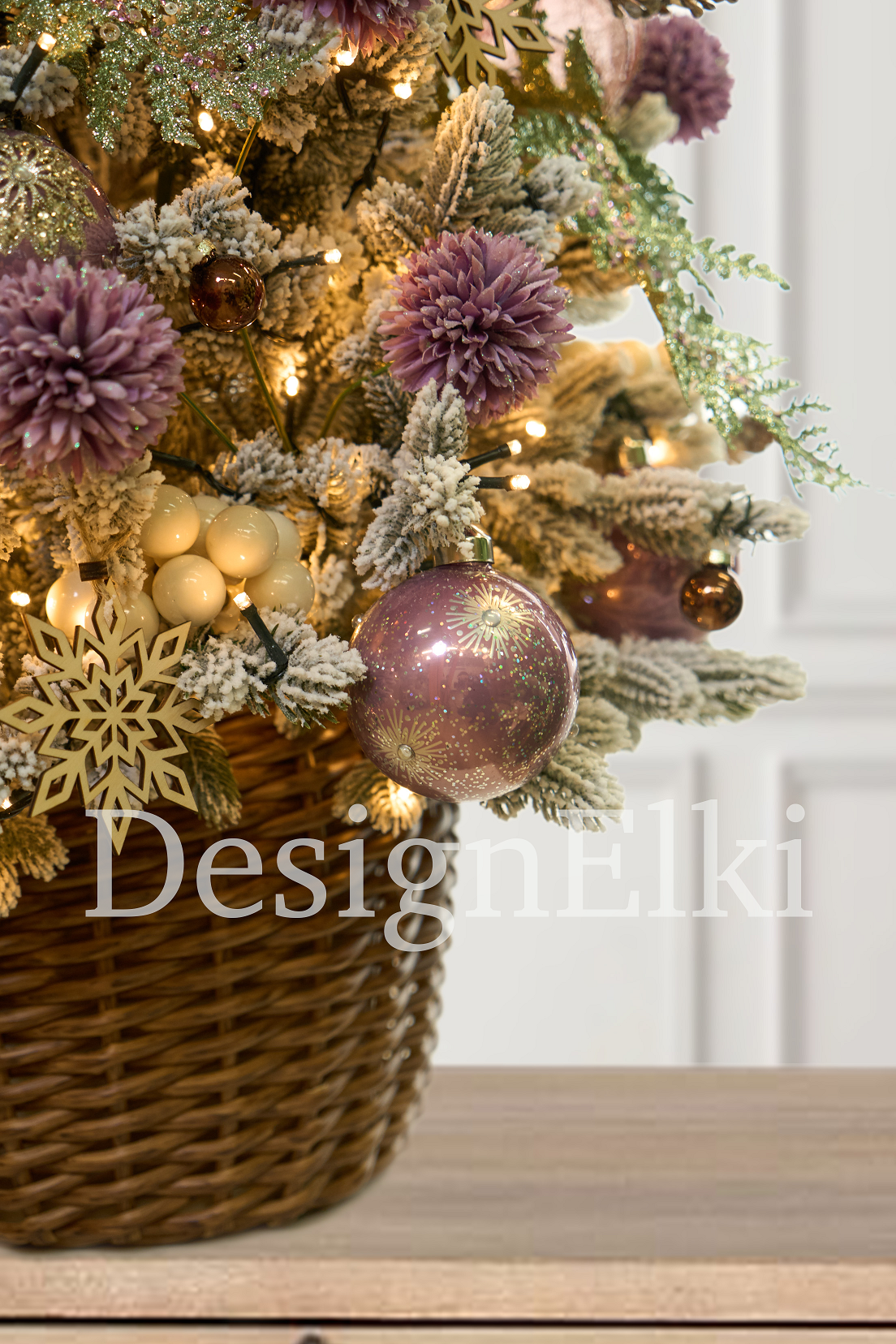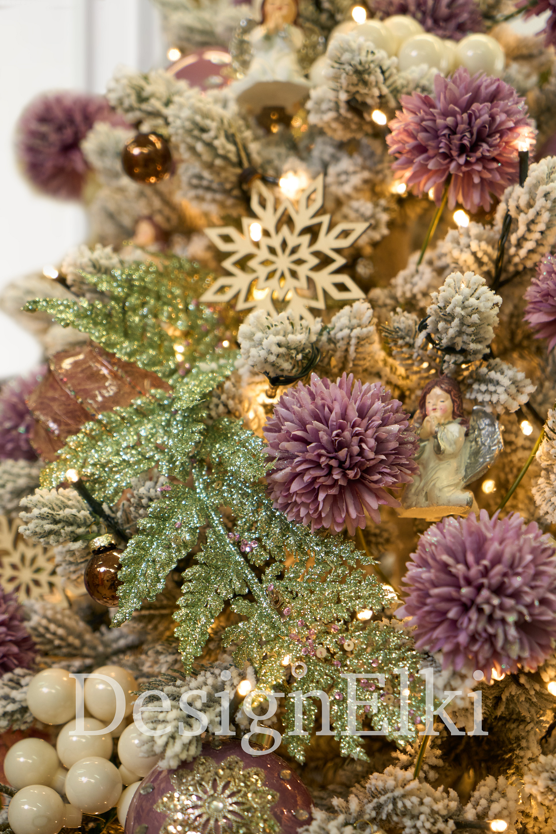 Дерево с нежным сиреневым декором непохоже на традиционные рождественские ели, где доминируют энергичные цвета – красный, зеленый и золотой. В этой работе дизайнер искусно сочетает разные фактуры и природные оттенки. Вырезанные из дерева снежинки и натуральные шишки делают образ по-домашнему уютным. Огоньки гирлянд причудливо отражаются на боках и в сердцевине стеклянных шаров. Сверху донизу пушистая крона усеяна звездочками-хризантемами с японских старинных гравюр. Миниатюрная новогодняя композиция украсит небольшие комнаты и офисные пространства.